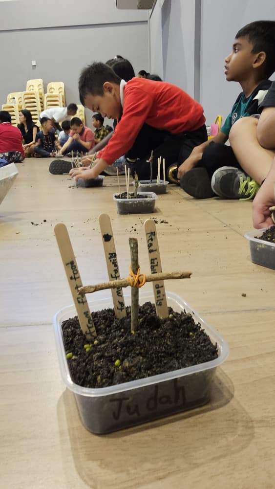 The highlight of the day was a planting activity. Each child received a small container, soil, mung bean seeds, and twigs to form a cross. They also wrote three Lenten promises, one for each pillar, on small sticks and placed them beside the cross.